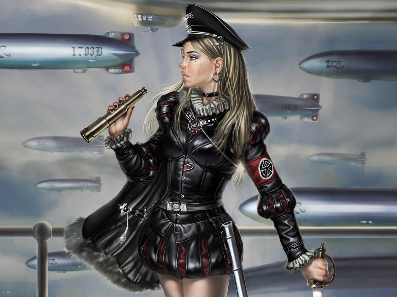 Фэнтези девушка в фуражке и с подзорной трубой.