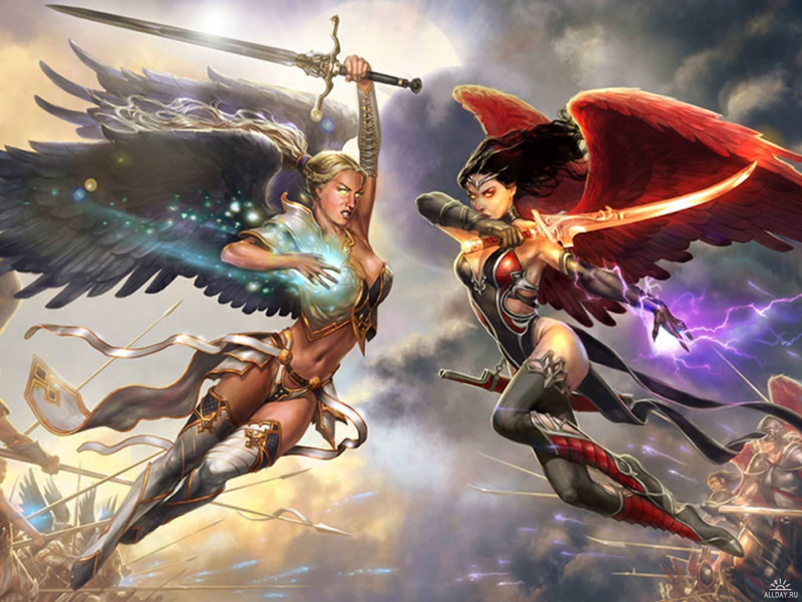 Ангел и демон, фэнтези девушки с мечами и с крыльями в бою, битва добра со злом.