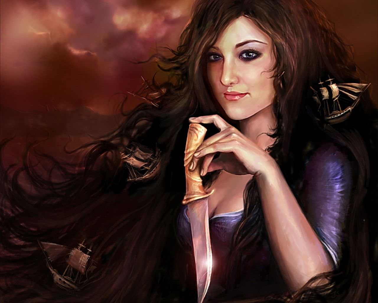 Затонувшие корабли в волосах, фэнтези девушка с кинжалом, с ножом.