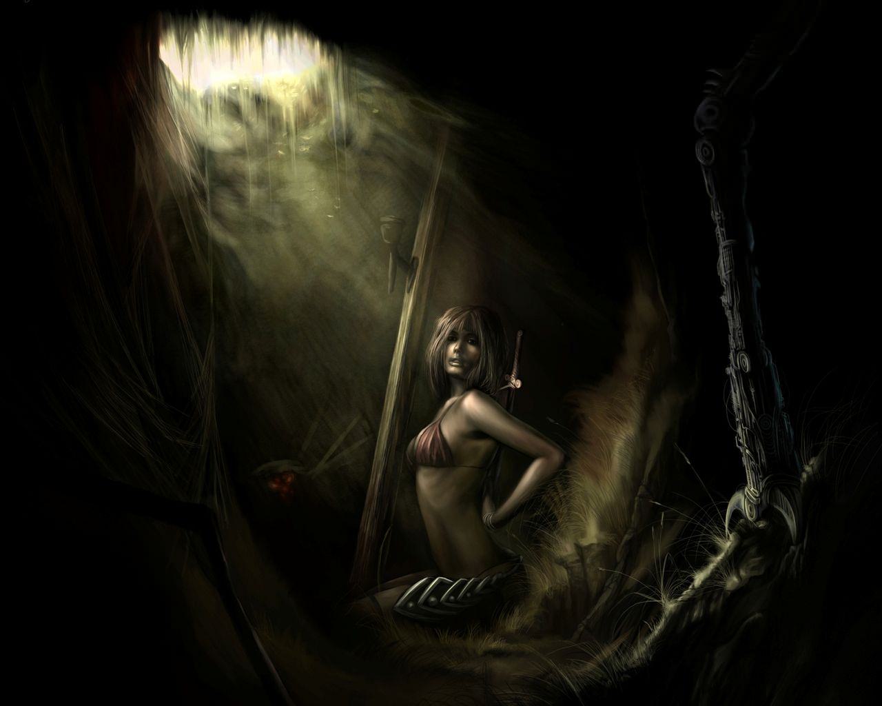 Фэнтези девушка в ловушке, воительница в яме, полуголая девушка-воин.