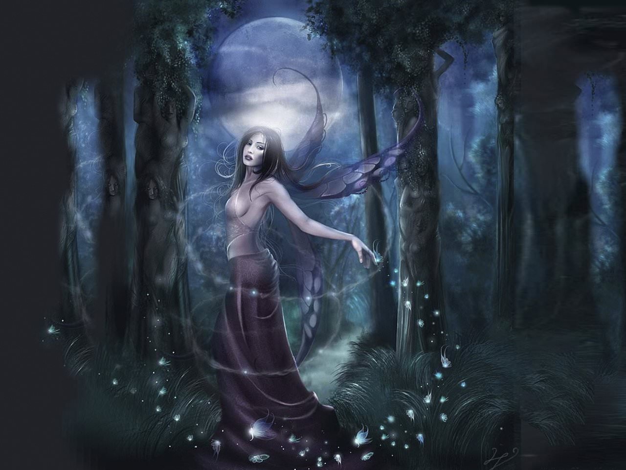 Одинокая ночная фея в лесу, нось, луна, деревья, трава, с крыльями.