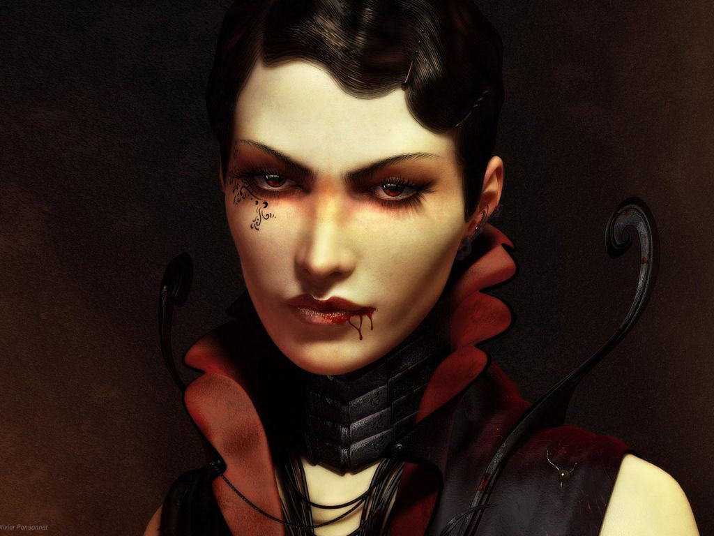 Вампирша, красные глаза, кровь на губах, тату под глазом, вампир, вампиресса.
