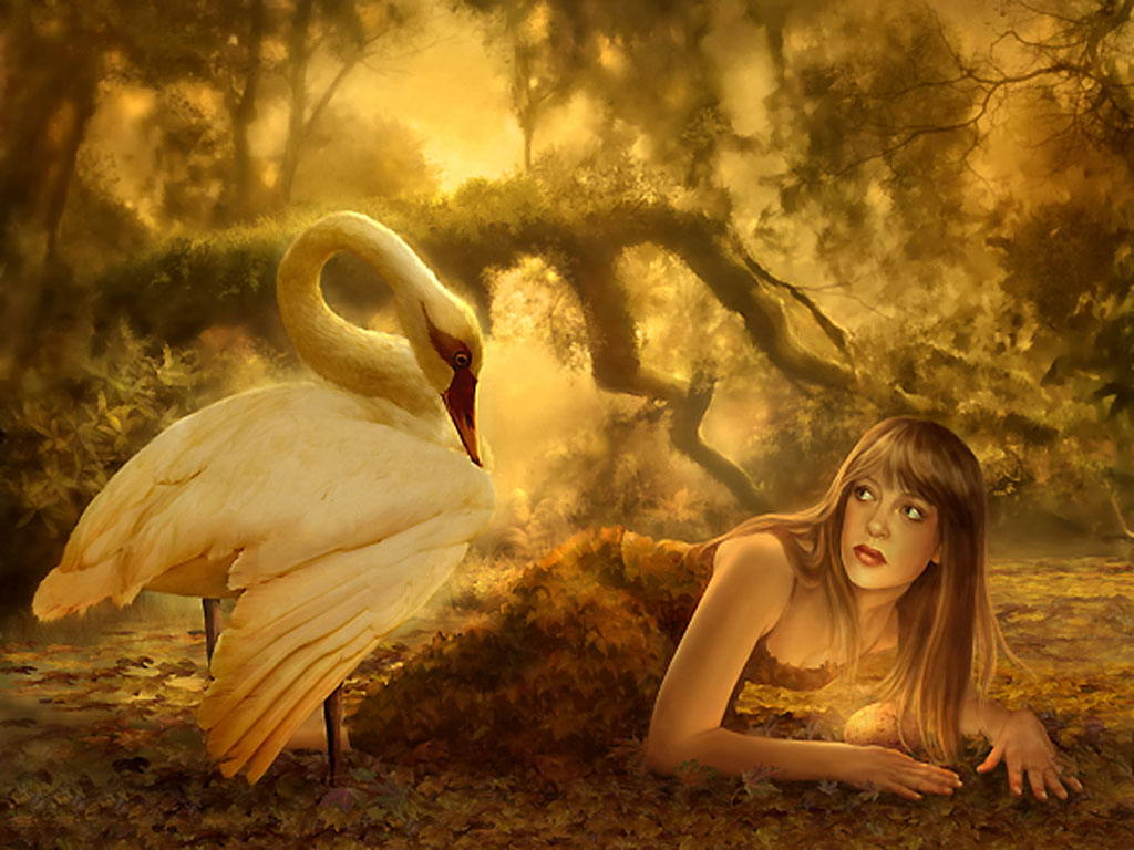 Лебедь, яйцо, девушка в листьях, лес, свет.