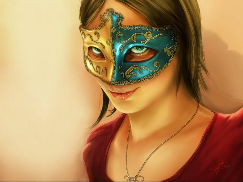 Коварный взгляд, девушка в маске, лицо, цепочка на шее.