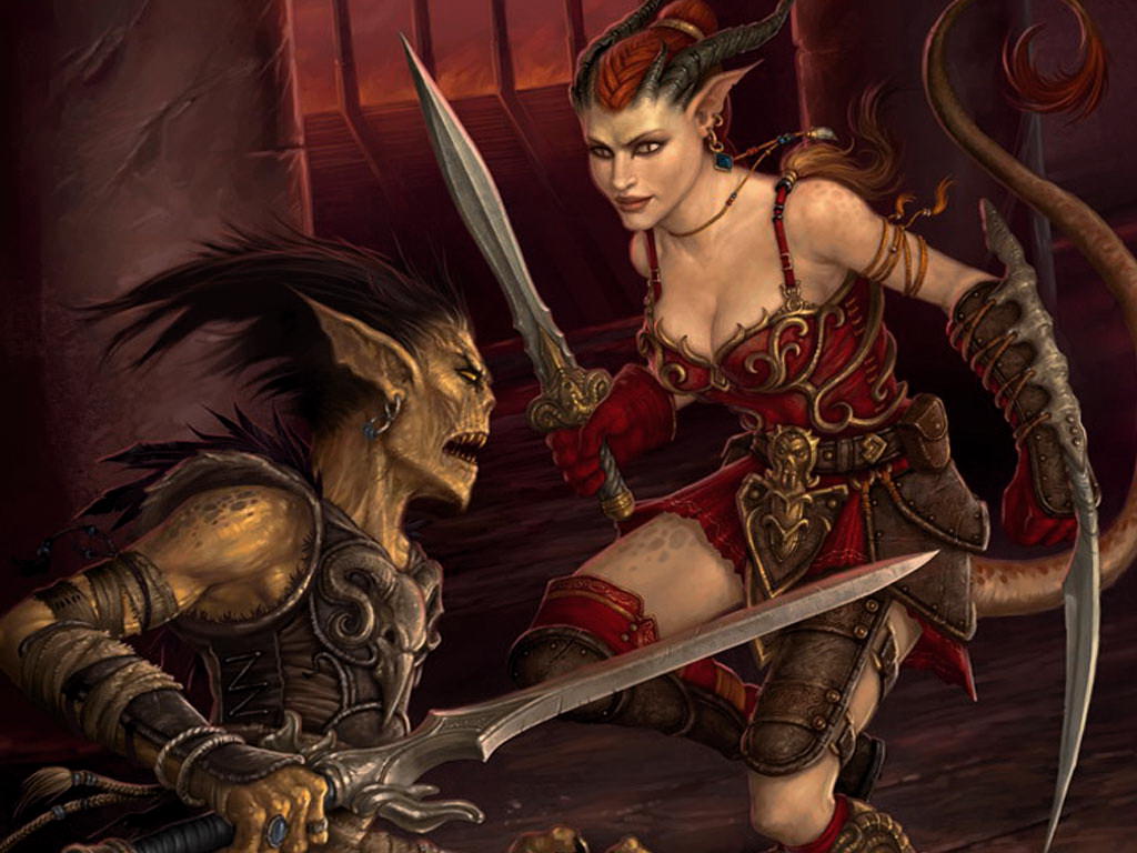 Женская резня, бой двух воительниц, девушка-монстр против рогатой девушки, девушки-войны с клинками, мечи.