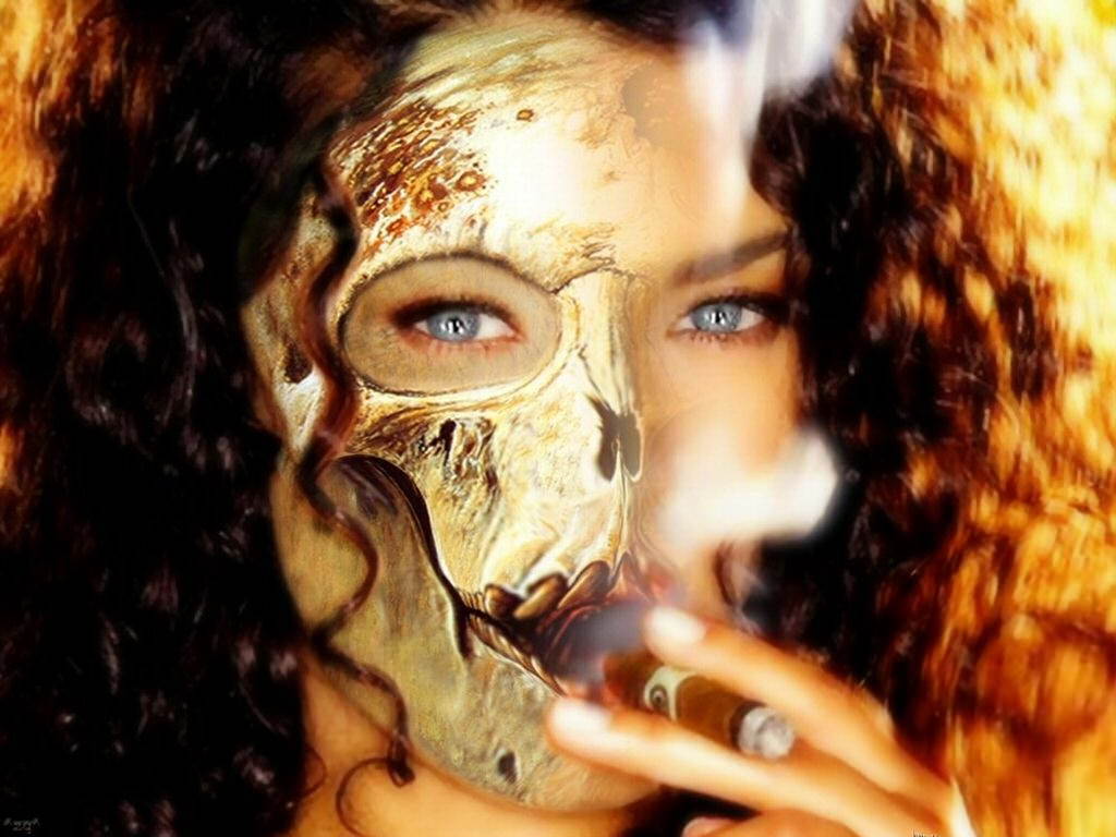 Покурим? девушка с сигарой, золотая маска черепа, курит, дым, огонь, лицо, взгляд.