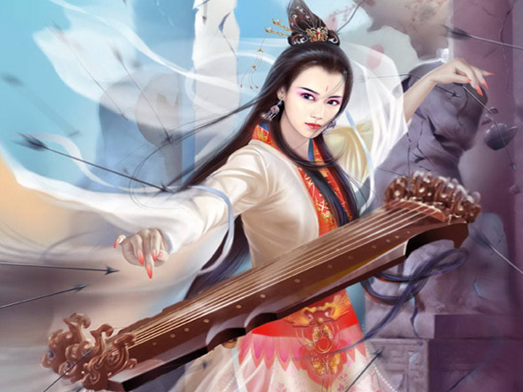Уворачивается от стрел, китайская девушка уклоняется от града стрел с музыкальным инструментом.
