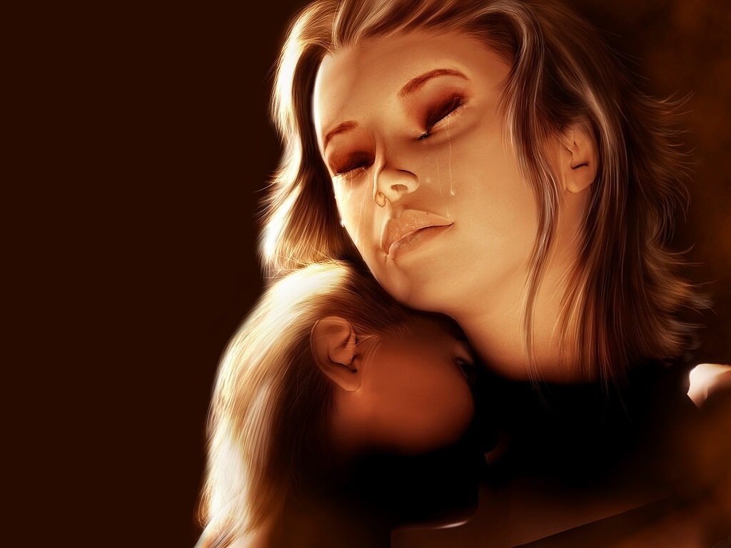 Материнские слезы, мать и дитя, девушка и дочка обнимаются, девушка плачет.