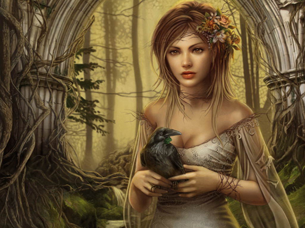 Ворон в руках очаровательной девушки, птица, красивая девушка в платье, цветы на голове, в волосах, деревья, корни, ветви, арка.Ворон, в, руках, очаровательной, девушки, птица, красивая, девушка, в, платье, цветы, на, голове, в, волосах, деревья, корни, ветви, арка |