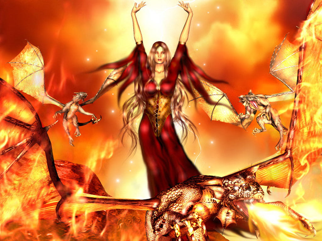 Управляет драконами, владычица драконов, огонь, пламя, драконы, девушка в красном.