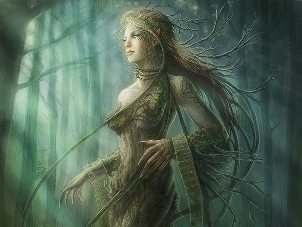 Лесная ведьма, девушка-дерево, магия превращения, лес, свет, лучи, деервья.