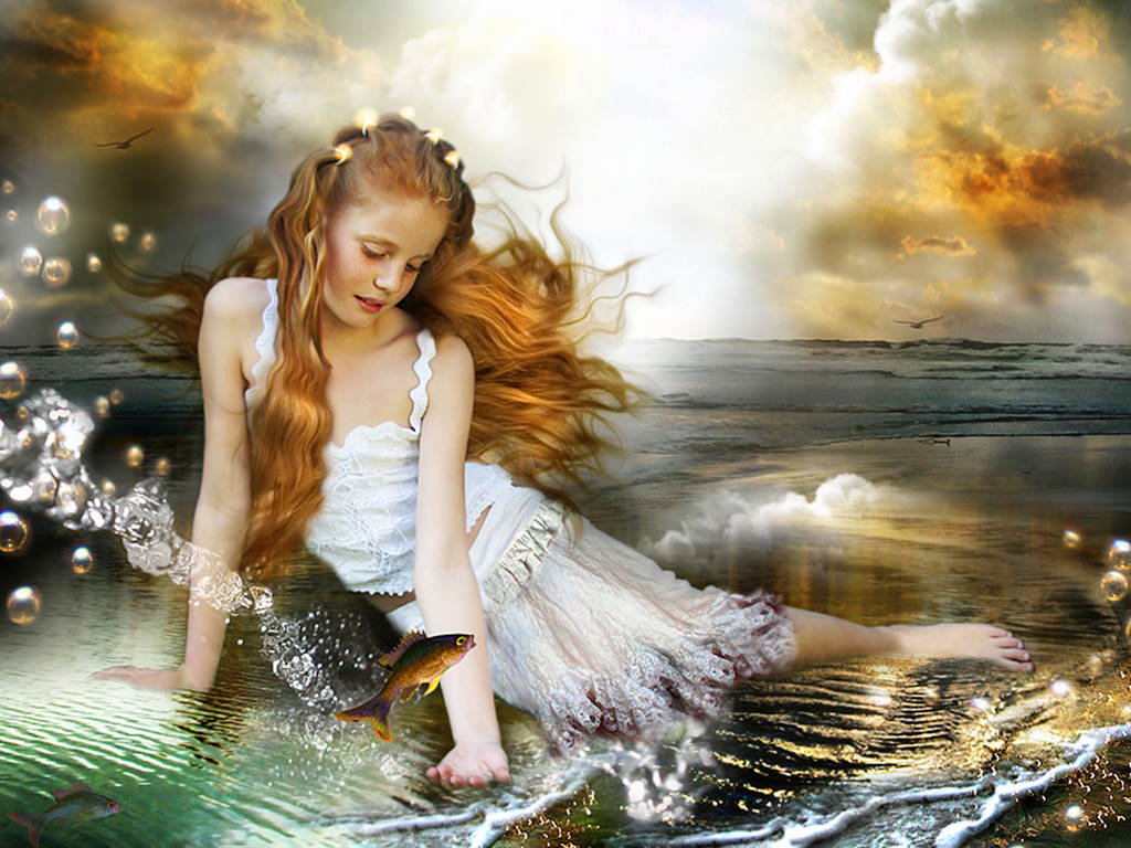 Девочка и рыбки, рыбы и одинокая девочка на море, пузыри.