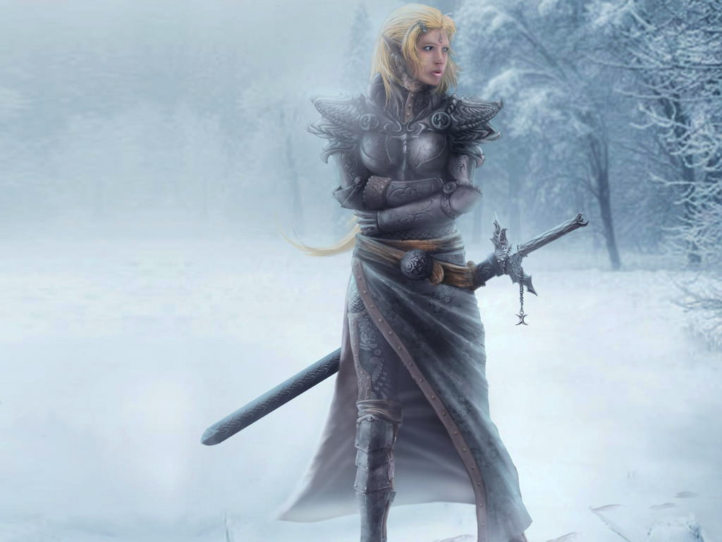 Военные холода, девушка в доспехах с мечом в зимнем лесу, снег, зима, воительница.