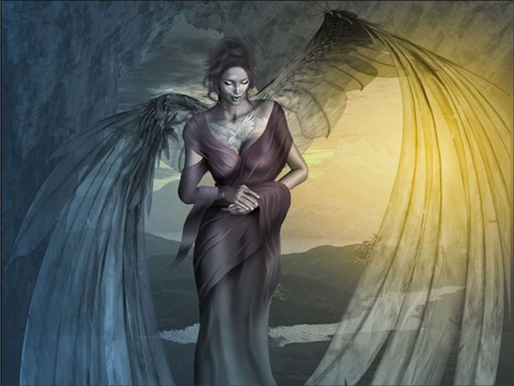 Соколиная душа, девушка в темном платье с крыльями, орел в груди, сокол, ястреб.