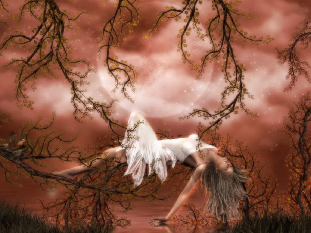 В красном тумане, девушка в белом платье лежит на ветвях деревьев над водой, луна.