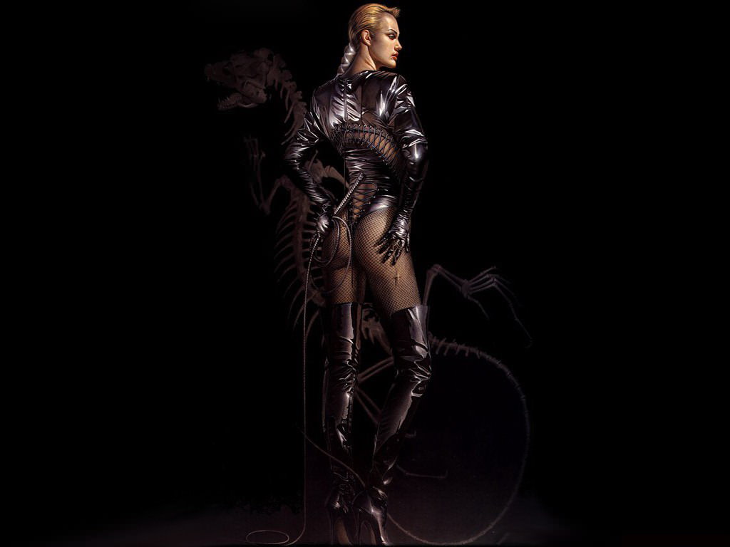 Девушка в кожанке с хлыстом, скелет динозавра, длинные высокие кожаные сапоги на каблуках.