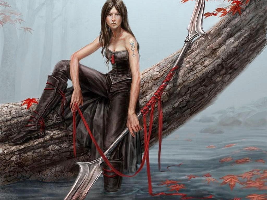 Красная лента на холодном оружии, тату на руке, листья в воде, деревья.