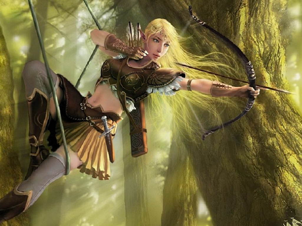 Эльфийская лучница на лианах, на деревьях, эльфийка с луком в лесу выцеливает жертву.
