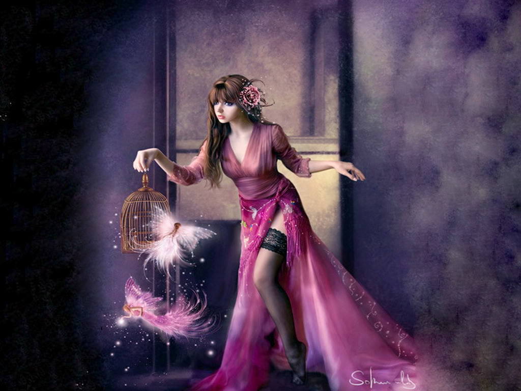 Прекрасная девушка в розовом платье, в чулках, клетка, роза на волосах, туман, феи.
