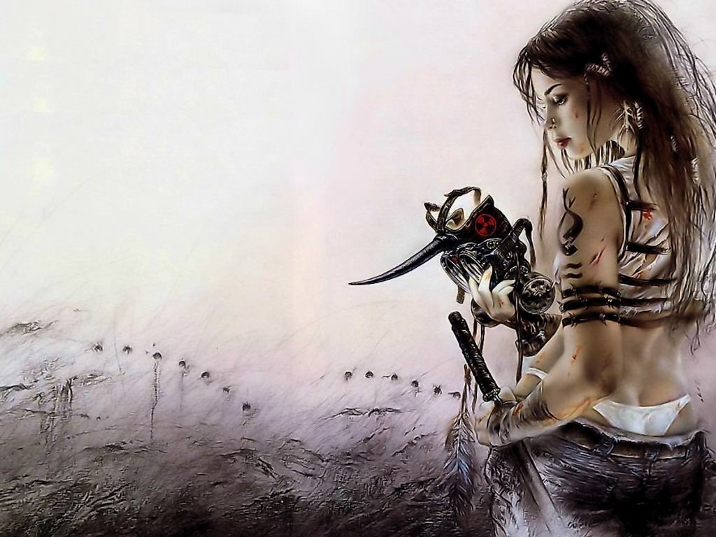 В опасном мире, девушка с мечом, рог, противогаз, девушка в трусиках с тату на руке.
