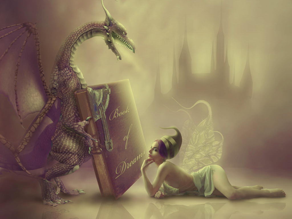 Книга мечтаний, книга снов, дракон с книгой, фея и дракон, замок в тумане.