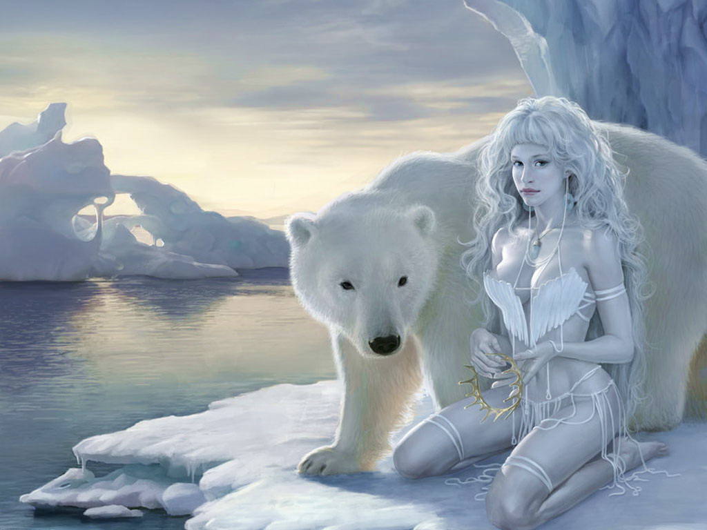 Полуобнаженная девушка и белый медведь, льдина, холодная вода, снег, "ледяная" девушка.