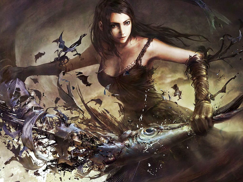 Разорвала "рыбешку", сильная фэнтези девушка в платье в перчатках.