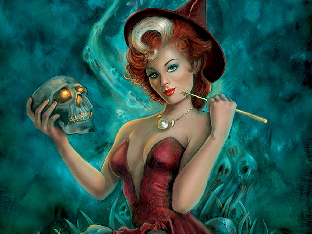 Ведьма с черепом, в шляпе, с волшебной палочкой, сексуальное декольте, красные губы колдуньи, черепа и души.