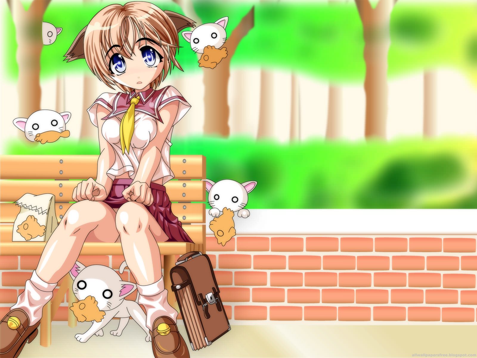 Аниме девушка и котята, школьница на лавке.