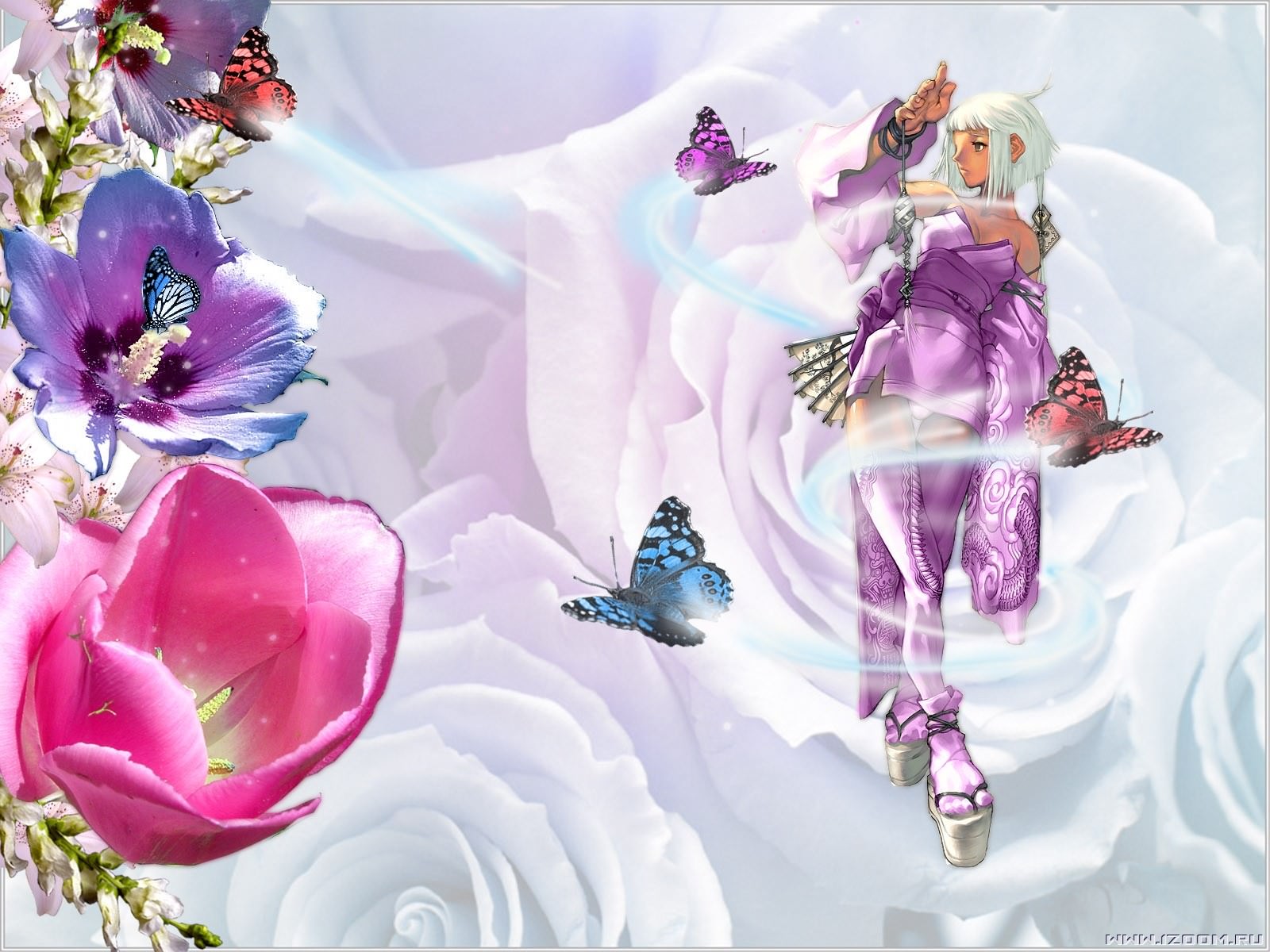 Аниме девушка, цветы и бабочки.