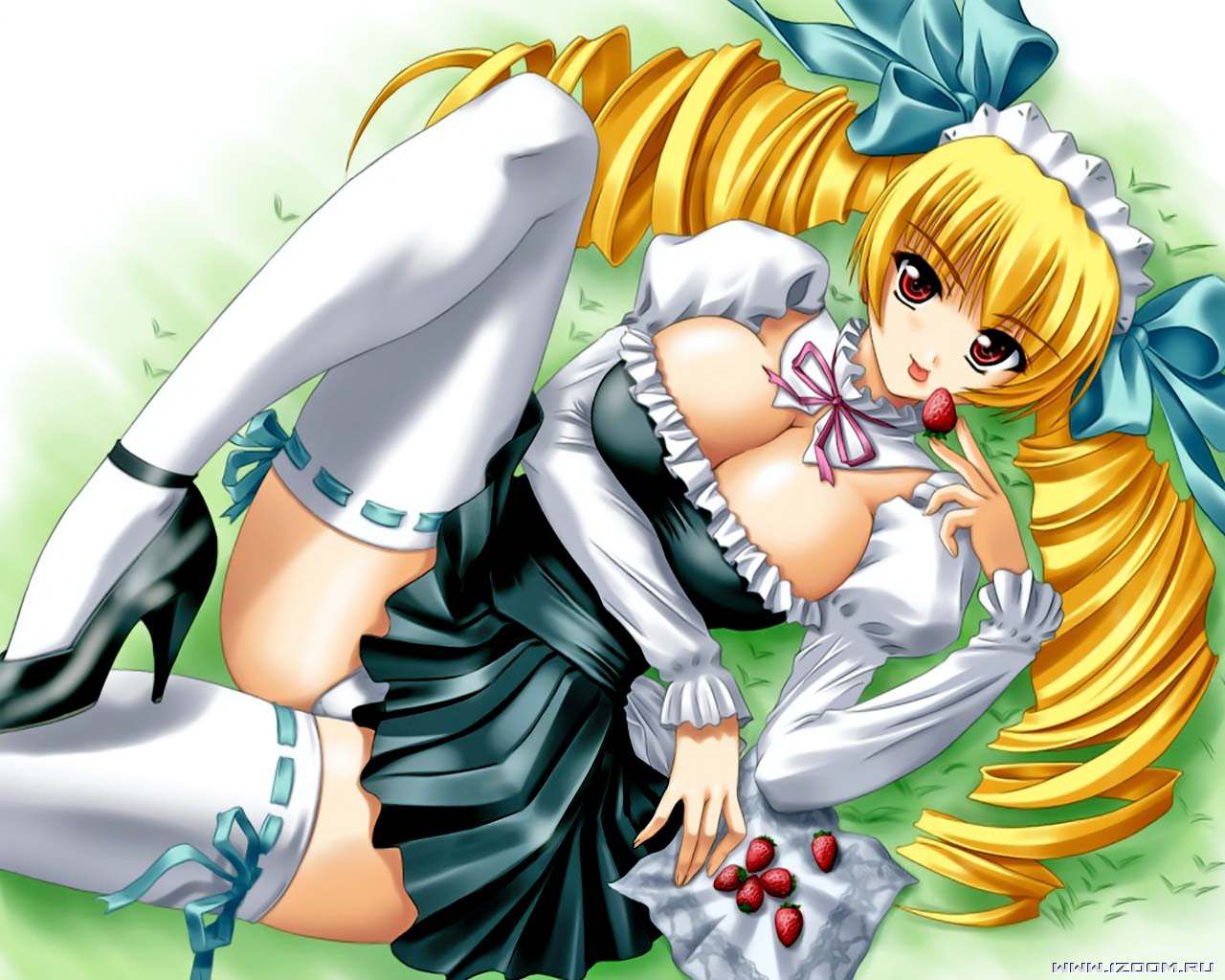 Аниме девушка с клубникой, в белых чулках, трусики под юбкой.