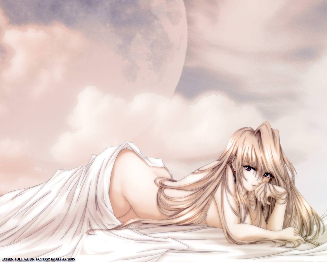 Обнаженная аниме девушка под одеялом.