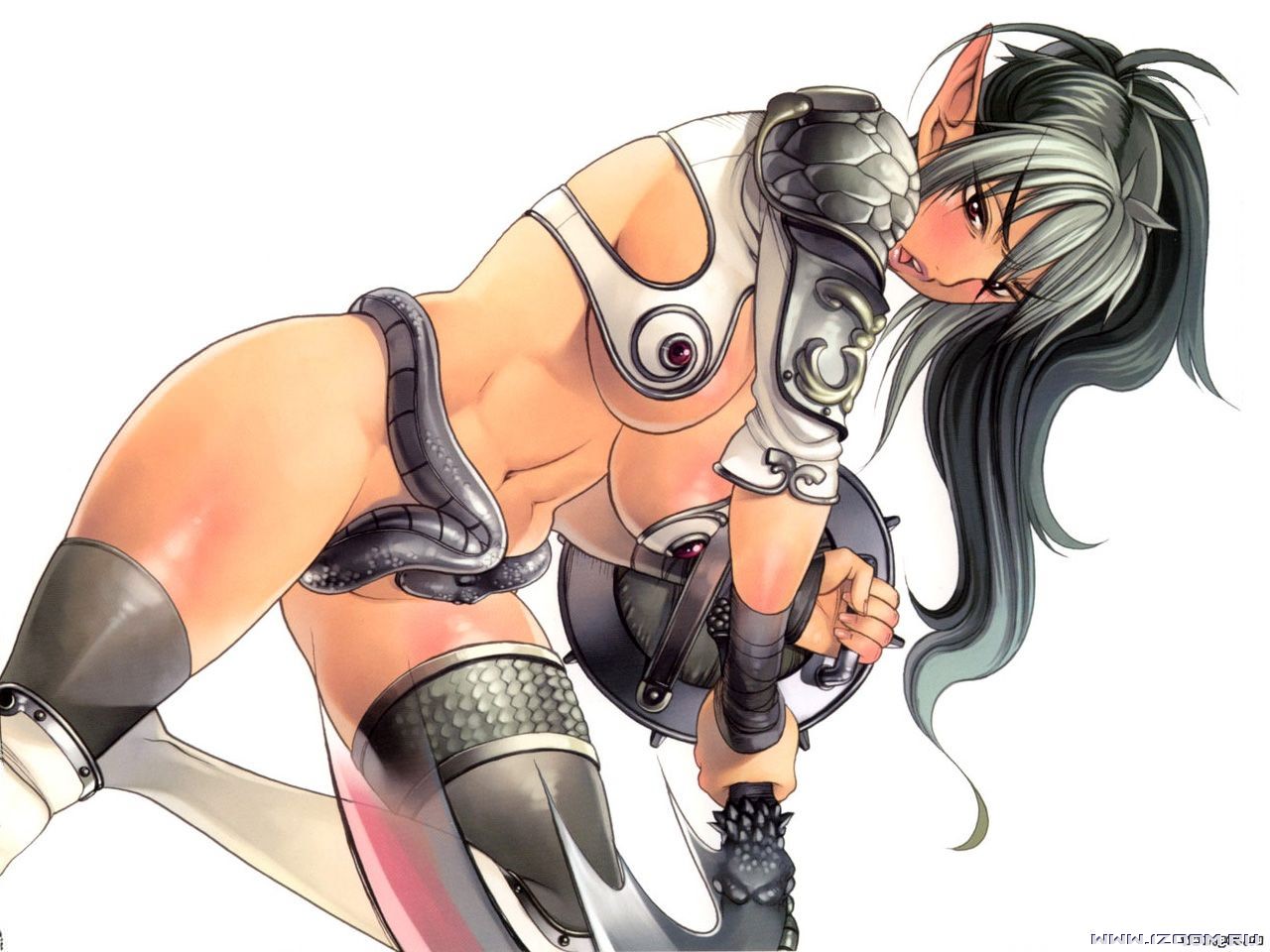 В эротичных доспехах, девушка с мечом и с щитом.