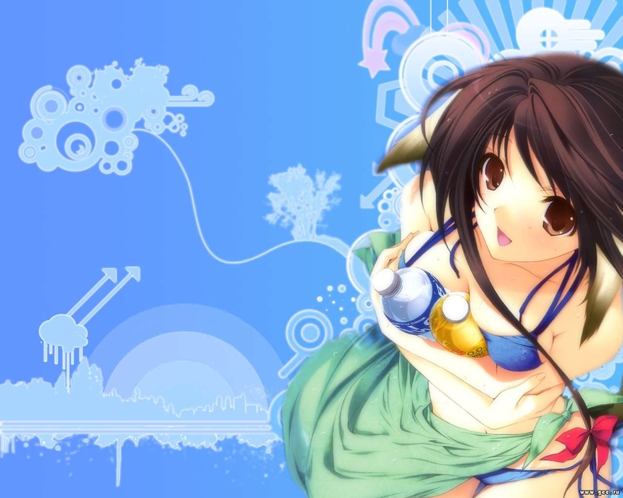 Напитки в сиськах, аниме девушка в бикини прижала напитки к груди.