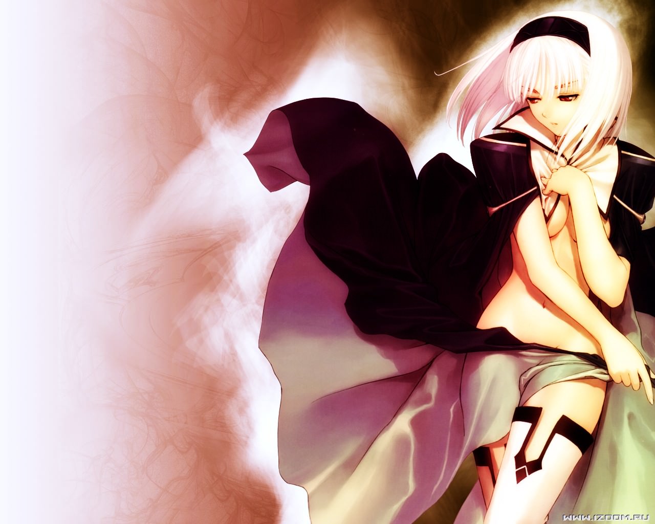 Скрывая красоту, полуобнаженная аниме девушка в черном плаще.