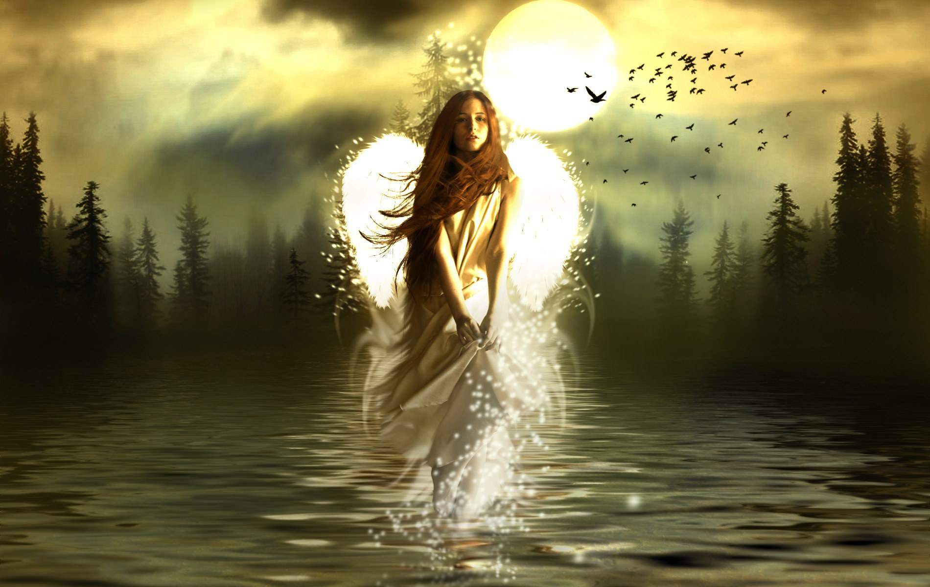 Ангел в сумерках над водой, птицы, поле, елки, деревья.