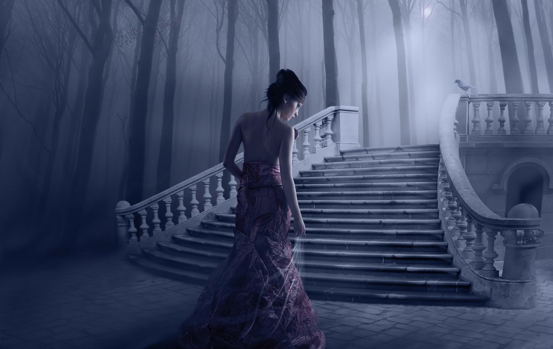 Девушка в вечернем платье, лестница в темном лесу, туман, деревья.