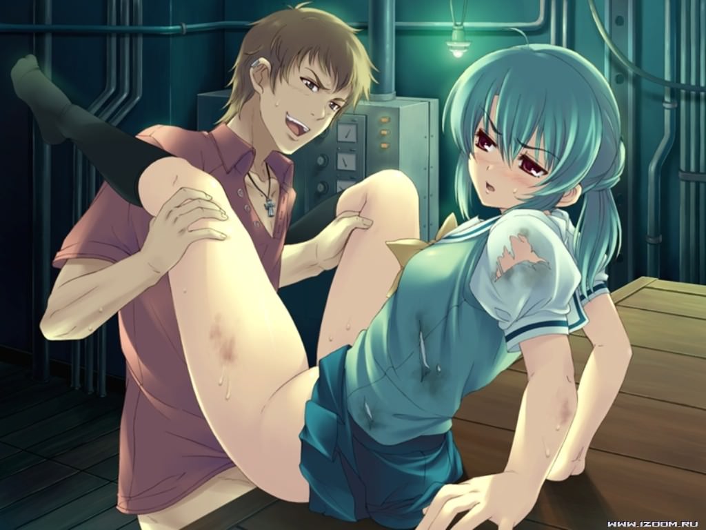 Хентай секс. Девушка в разодранной одежде без трусиков под юбкой, парень раздвинул ножки девушке и трахаете ее.