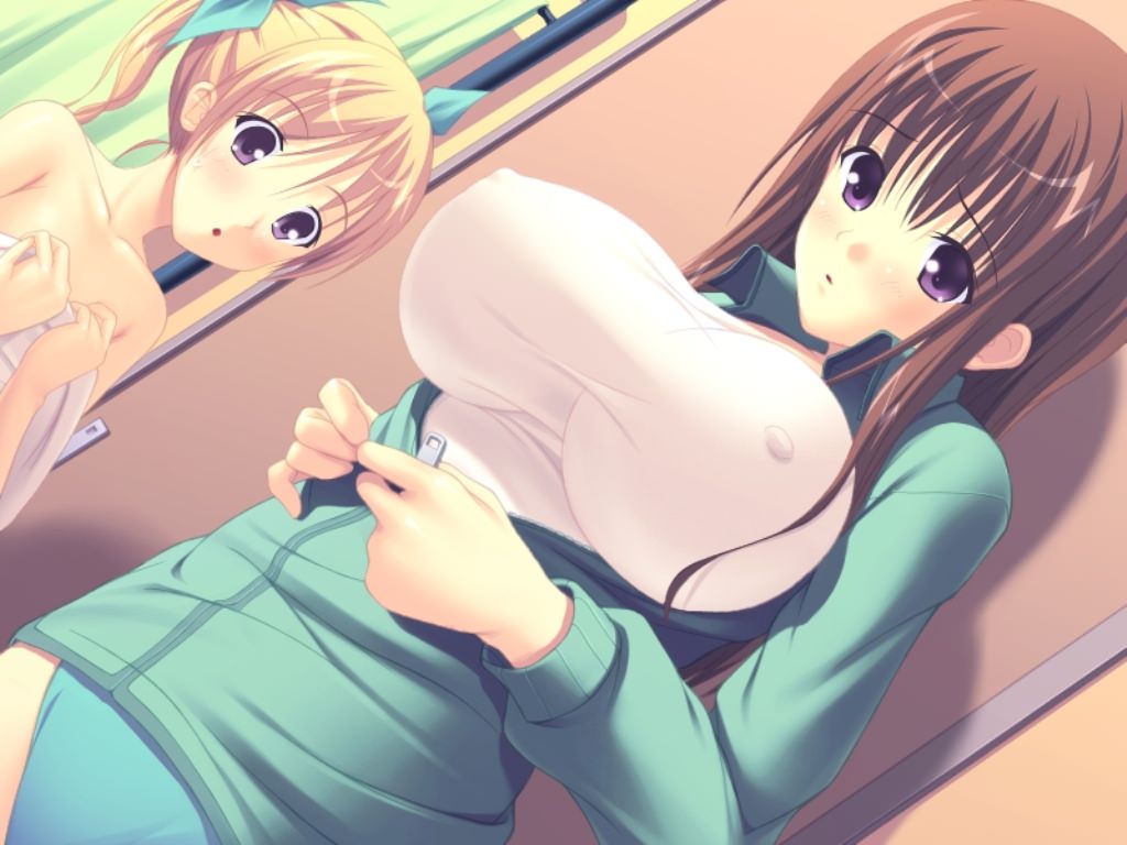 Сиськи выпирают, большие аниме сиськи, удивление.