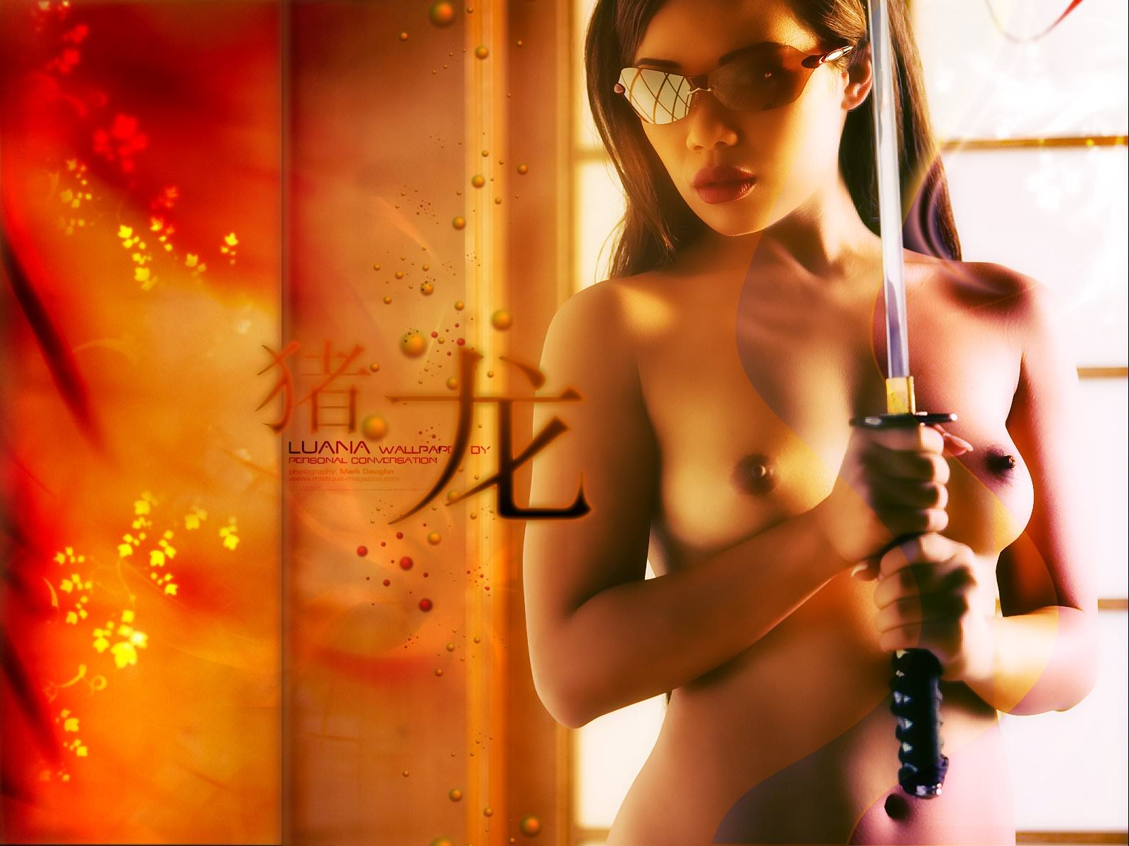 Голая японка с катаной, обнаженная азиатка с самурайским мечом, Luana в очках.