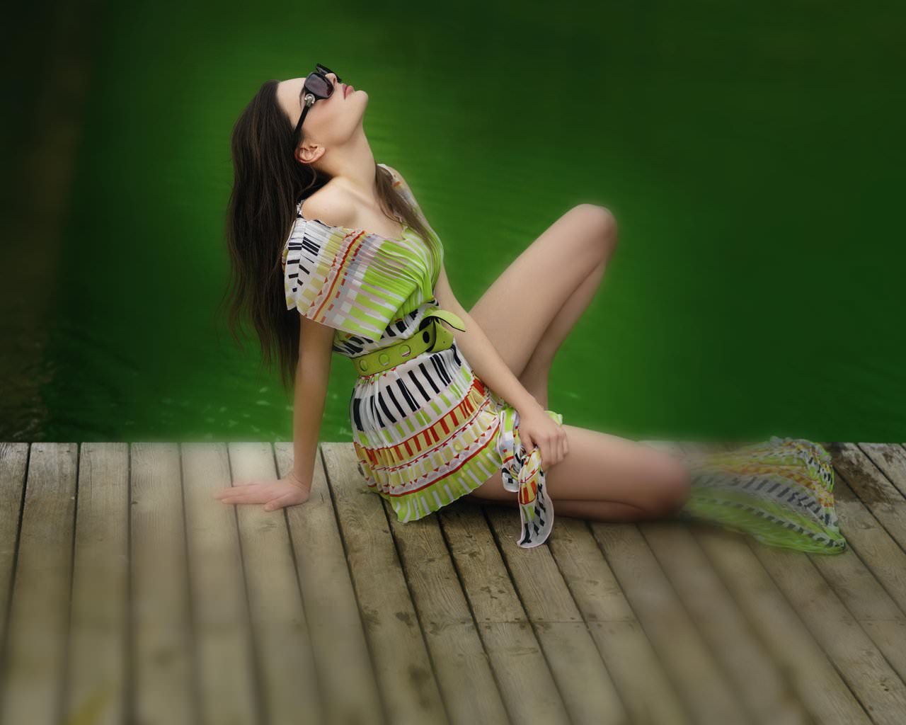 Девушка в ярком платье сидит на мостике у зеленой воды.