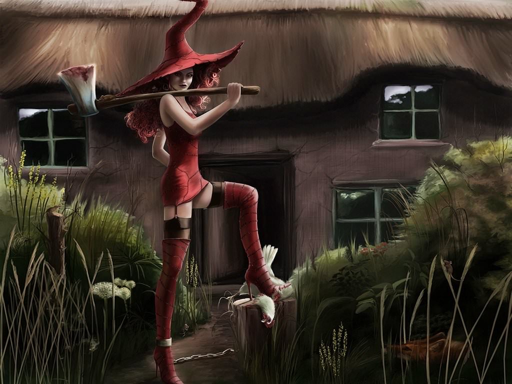 Куры больше не несут яйца, девушка в красном с окровавленным топором, убийца кур, хэллоуин.