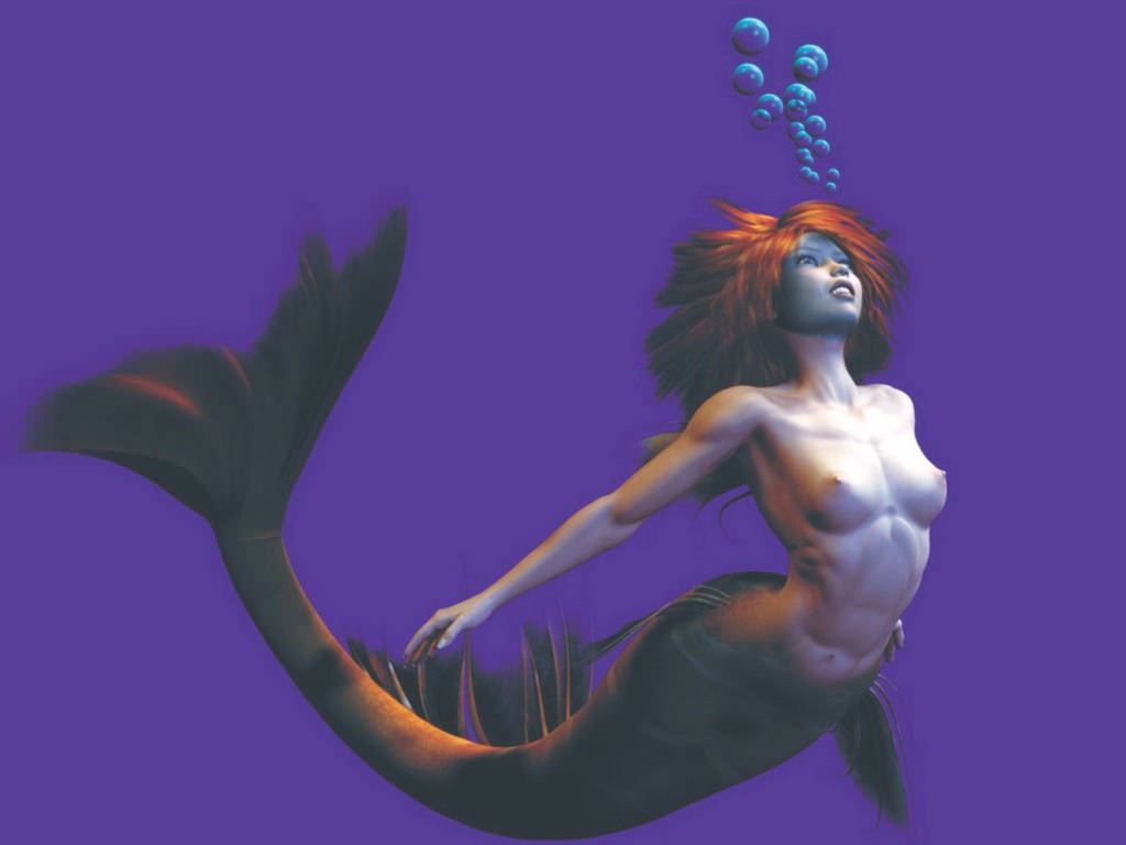 Рыжеволосая русалка с обнаженной грудью, пузыри, русалочка под водой.