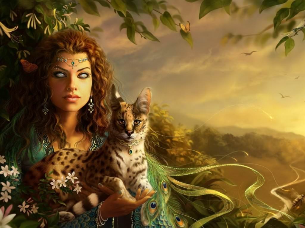 Укротительница леопардов, красивая девушка с белыми глазами и леопард, лес, природа, птицы, долина.