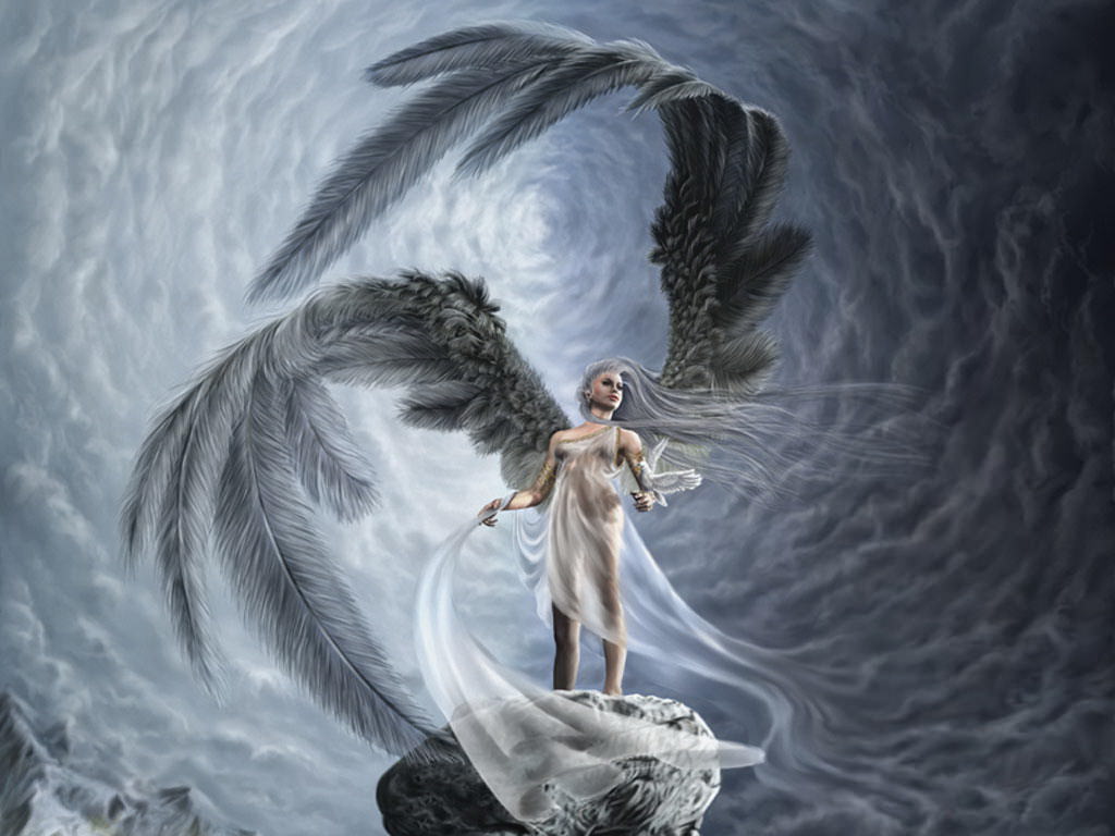 Ангел в бурлящем небе, темные облака.