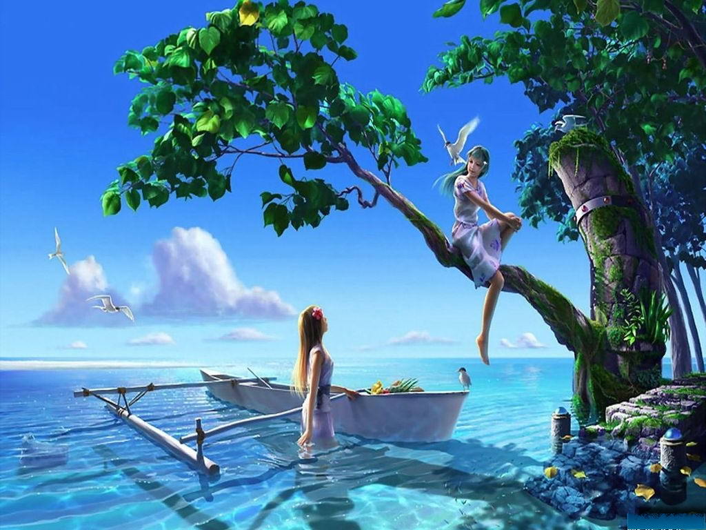 Девушки, лодка, голубое море, голубое небо, дерево, птицы, зеленые листья.