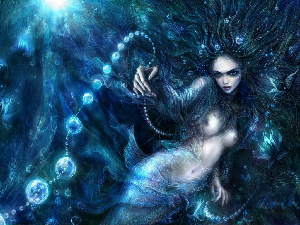 Морская дива с обнаженной грудью, красивые сиськи морской обитательницы, бусы из пузырей, водная красавица.