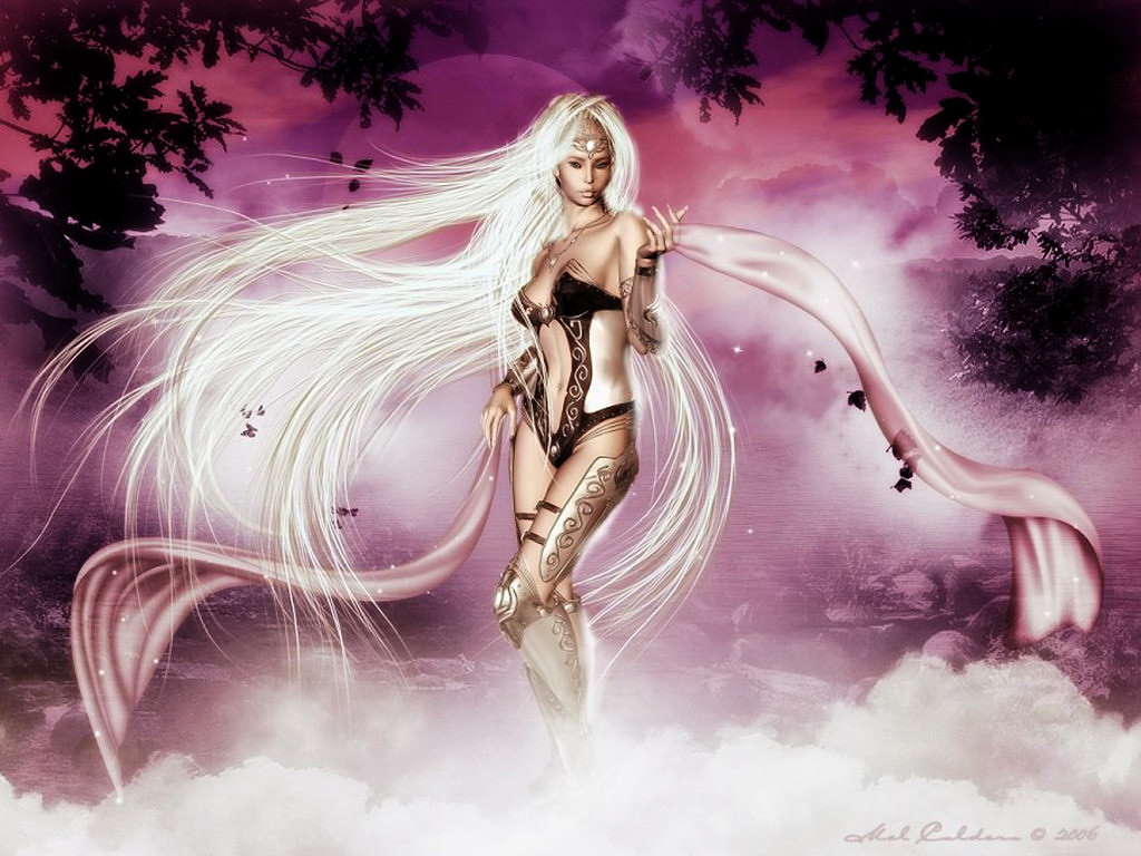 Сексуальная фэнтези девушка с длинными белыми волосами, туман, дым, розовое небо.