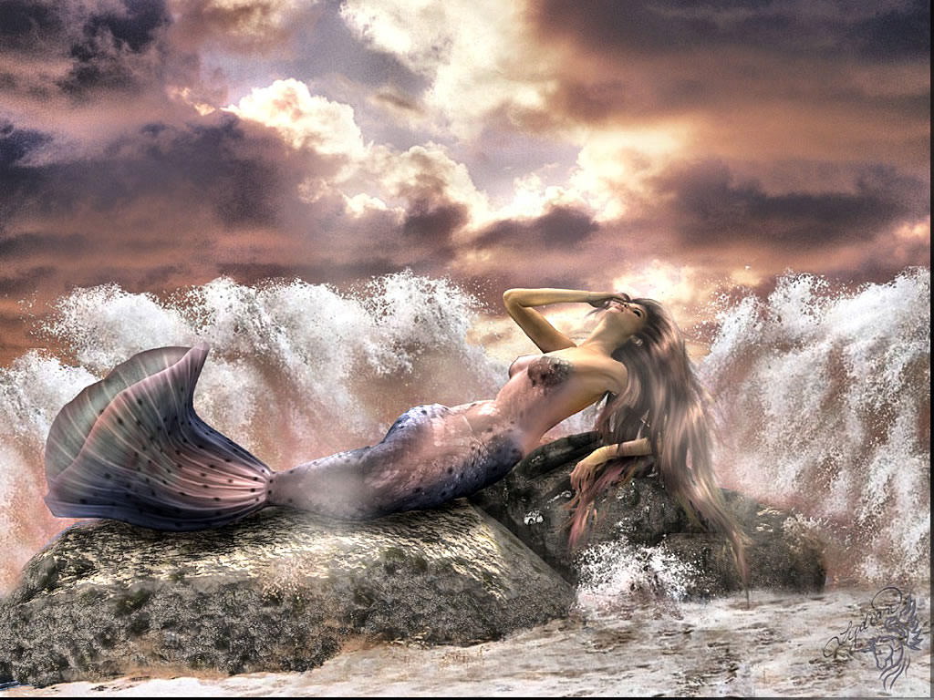 Русалка на камнях, волны, облака, море.