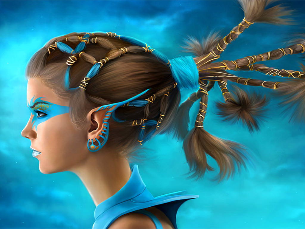 Эльфийка с необычной прической, голубые цвета.